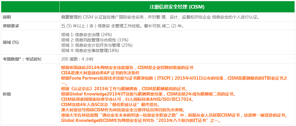 根据Global Knowledge2015年IT技能与薪酬调查结果,CISM连续2年成为薪酬第二高的证书。
