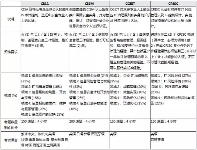 本指南介绍以下认证:注册信息系统审计师 (CISA)、注册信息安全经理 (CISM)、企业信息科技管治认证 (CGEIT)和风险及信息系统 监控认证 (CRISC)。各项简介如下: